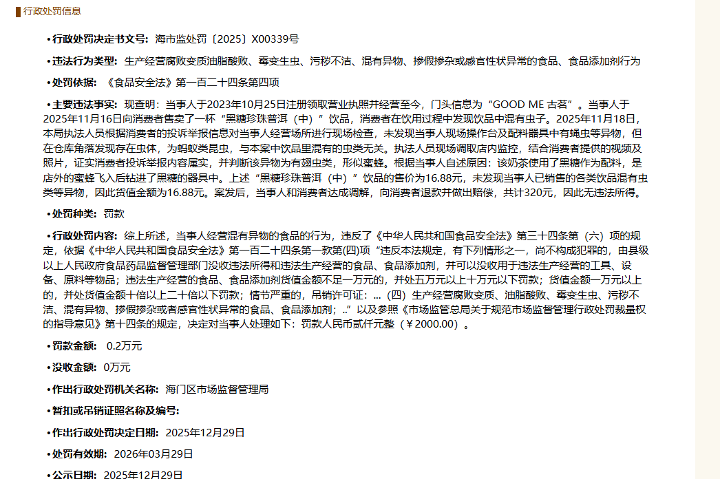 次要违法现实:现查明:当事人于2023年10月25日注册领取停业执照并运营至今,门头消息为“GOOD ME 古茗”。当事人于2025年11月16日向消费者售卖了一杯“黑糖珍珠普洱(中)”饮品,消费者正在饮用过程中发觉饮品中混有虫子。2025年11月18日,本局法律人员按照消费者的赞扬举报消息对当事人运营场合进行现场查抄,未发觉当事人现场操做台及配料器具中有蝇虫等异物,但正在仓库角削发现存正在虫体,为蚂蚁类虫豸,取本案中饮品里混有的虫类无关。法律人员现场调取店内,连系消费者供给的视频及照片,消费者赞扬举报内容失实,并判断该异物为有翅虫类,形似蜜蜂。按照当事分缘由:该奶茶利用了黑糖做为配料,是店外的蜜蜂飞入后钻进了黑糖的器具中。上述“黑糖珍珠普洱(中)”饮品的售价为16。88元,未发觉当事人已发卖的各类饮品混有虫类等异物,案发后,当事人和消费者告竣调整,向消费者退款并做出补偿,共计320元,因而无违法所得。