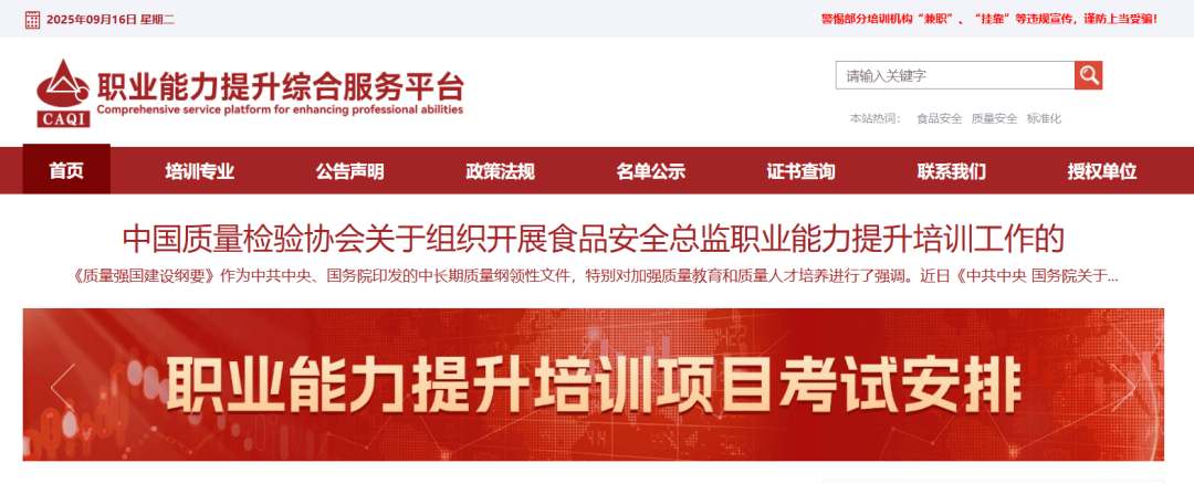 食物出产、加工企业中的高级办理人员和食物平安工做次要担任人,餐饮企业的高级办理人员和食物平安工做次要担任人,企事业单元中食物平安工做次要担任人和分担带领,畅通范畴相关企业的食物平安工做次要担任人,相关从管部分的食物平安监管人员,有志于处置食物平安办理工做的相关专业手艺人员等。培训完成报名且获得授权的进修账号后,可按照本身需要随时登录上述线上培训办事平台进行正在线年第四时度起头,拟正在每个季度的最初一个周六或周日进行培训测验(具体放置以本协会网坐发布通知为准);培训完成对应课程所需需要学时的进修后,按照相关要乞降相关登录上述线上培训办事平台正在时间内进行同一测验。第一步:正在旅逛器输入进入 中国质量查验协会官网,或者百度搜刮“中国质量检 验协会”进入官网。第二步:官网页面下滑点击“职业 能力提拔培训栏目” ,进 入职业能力提拔分析办事平台。第三步:进入《职业能力提拔分析 办事平台》点击进修中 心,进入登录页面输入账 号及暗码,点击登录。中国质量查验协会是由质量查验行业取质量范畴的质量查验手艺机构和专家学者、工做者,相关科研院所、大专院校、学术机构、取质量查验相关工做的社会相关人士等志愿结成的、行业性、非营利性社会组织,具有法人资历。中国质量查验协会筹备于1986年,并于1992年正式成立,登记办理机关为平易近政部,行业次要办理部分为国度市场监视办理总局(简称国度市场监管总局),国度市场监管总局承认检测司。国度市场监管总局2018年4月组建成立之前,中国质量查验协会历任营业从管部分为原国度质量监视查验检疫总局(简称原国度质检总局)、原国度质量手艺监视局、原国度手艺监视局、原国度经济委员会质量局。